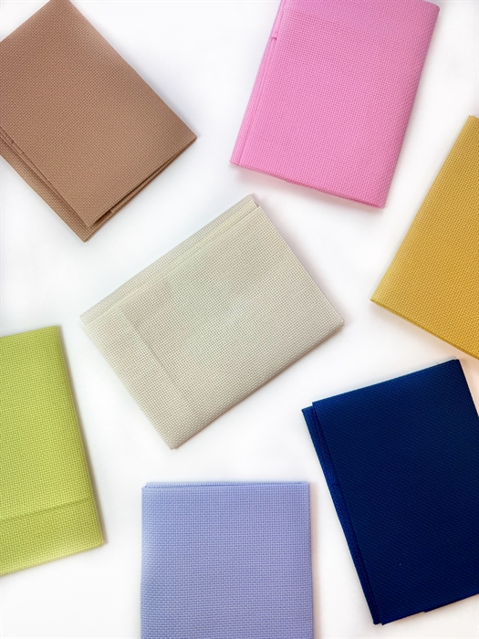 Forklippede stykker af Aida 5,4 trd/cm i forskellige farver.
