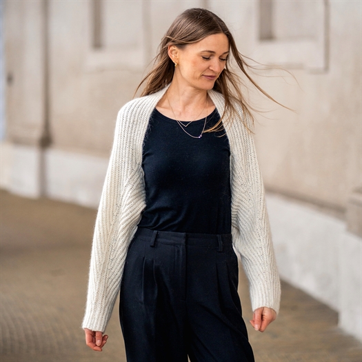 Designet er elegant med mange muligheder for styling. Den er velegnet både til hverdagsbrug og særlige lejligheder. Konstruktionen gør det muligt at justere både ærme- og ryglængde, så cardiganen får præcis den pasform, der føles rigtig for dig. Airy cardigan er et tidløst og sanseligt design, der forener komfort og enkelthed med et moderne nordisk udtryk - en cardigan, der er lige så behagelig at strikke, som den er at have på.