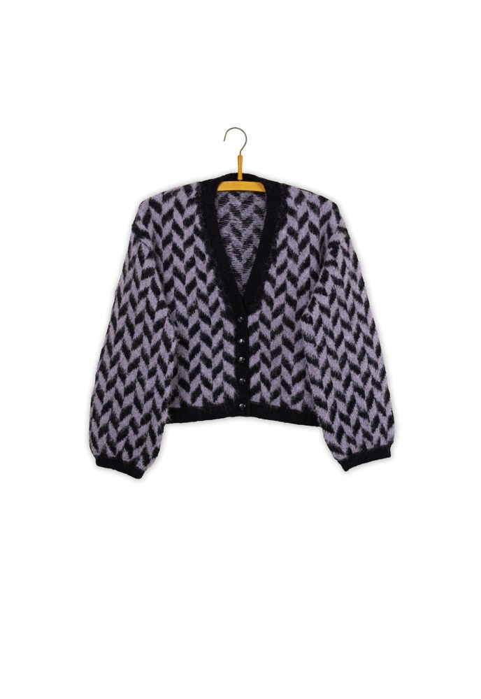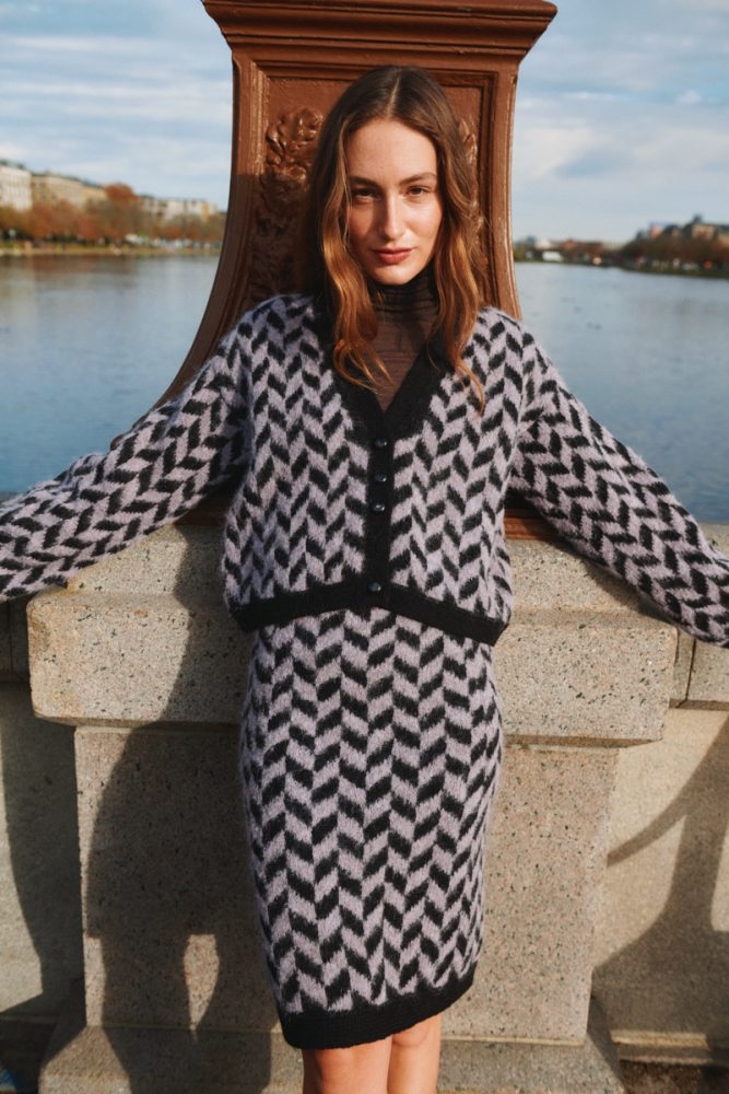 Billie Jean Jacket er en model med skrånende skuldersøm, dyb v-hals, lange ærmer og et spændende tofarvet mønster i jacquard. Først strikkes bagstykket med udtagninger i hver side, der senere vil danne en skrånende skulder. Der strikkes masker op langs hver skulderskråning, hvorfra hver af forstykkerne laves hver for sig, med udtagninger mod brystet. Efter ærmegab samles for- og bagstykker og arbejdet strikkes videre frem og tilbage til ønsket længde. Kroppens afsluttende kant samt stolper strikkes nu ud i ét i ensfarvet dobbeltstrik med knaphuller i åbningens højre side. Der strikkes masker op i ærmegabsåbningen. Ærmerne strikkes rundt og lige ned i mønster, og afsluttes ligeledes med en ensfarvet dobbeltstrikket kant.