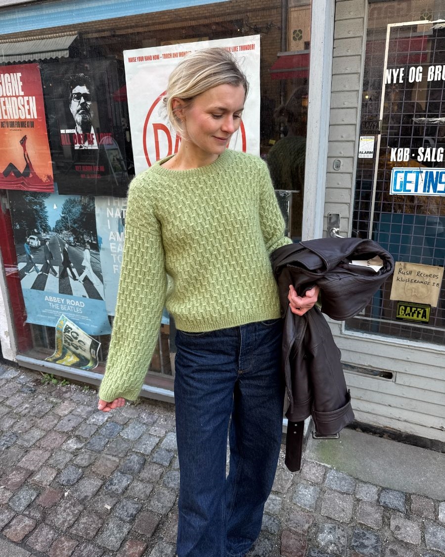 Den grønne Jenny Blouse er strikket i Sunday fra Sandnes Garn i farve 9533 Green Tea sammen med Silk Mohair fra Isager i farve 57.