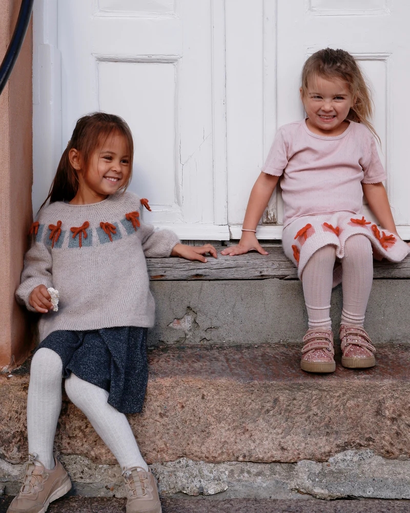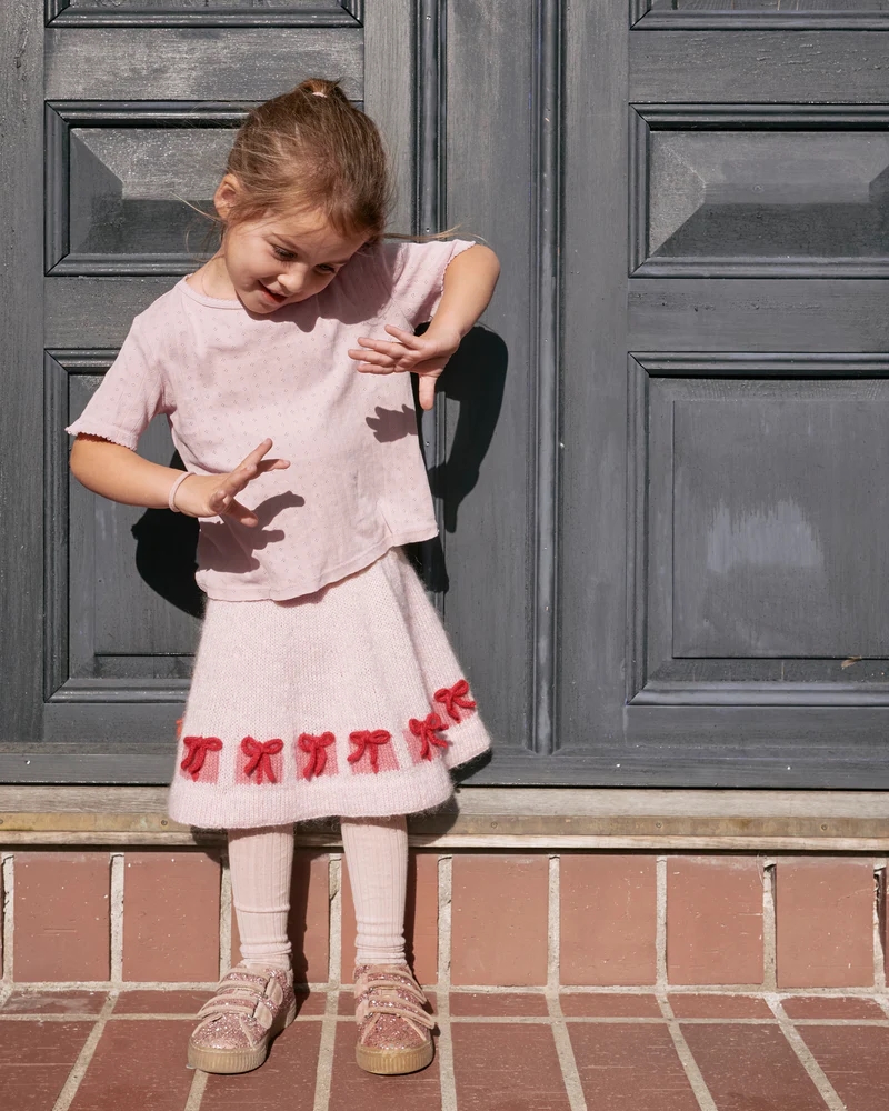 Nederdelen strikkes rundt nedefra og op i glatstrik, og langs den nederste kant strikkes små pakker som pyntes med sløjfer lavet af i-cordbånd. Nederdelen afsluttes med en ombukskant. Til sidst trækkes en elastik gennem linningen, så nederdelen får en behagelig og fleksibel pasform.