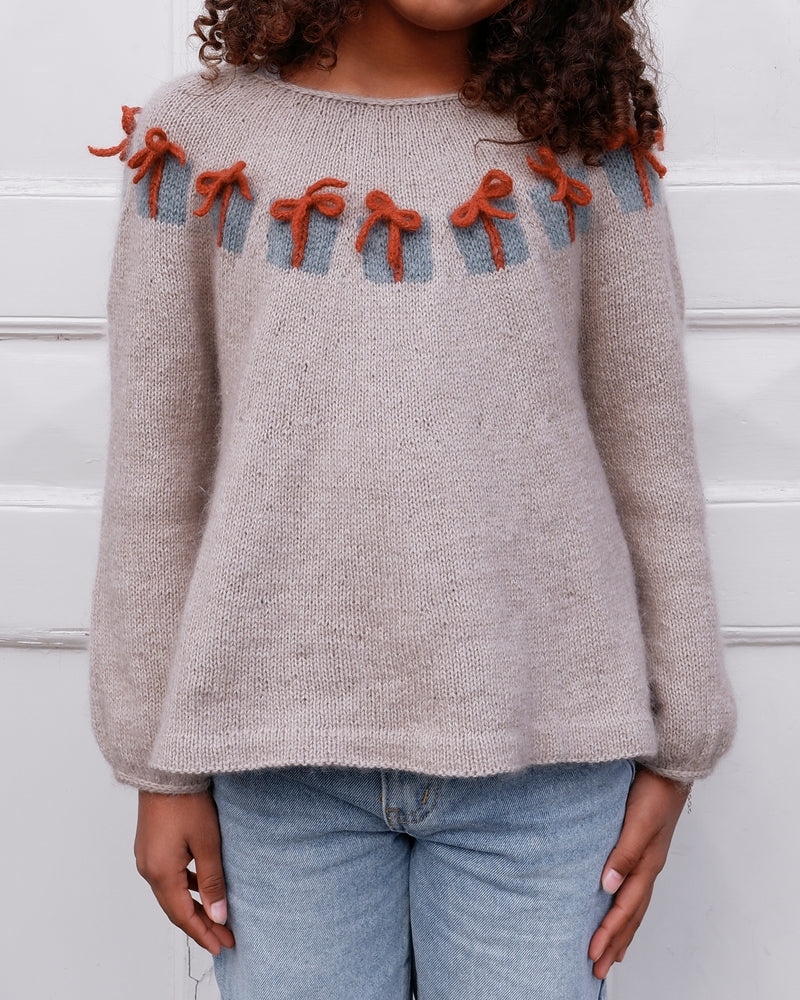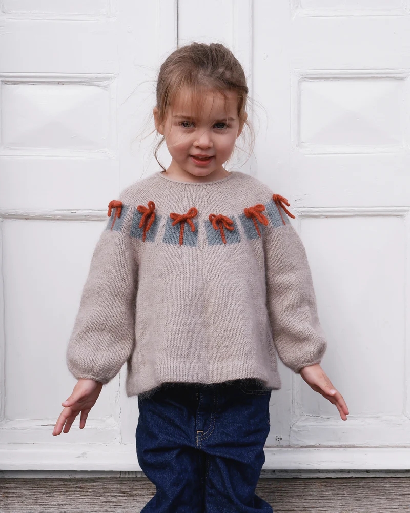 Blusen har små pakker på bærestykket, med sløjfer lavet af i-cordbånd. Blusen har en let A-facon og ballonærmer, der afsluttes med en i-cordkant. Halskan afsluttes ligeledes af en i-cordkant, der ender ud i en sløjfe i nakken. Blusen strikkes oppefra og ned med et rundt bærestykke. Julegaverne strikkes efter diagram og til sidst sættes i-cordbånd på pakkerne.