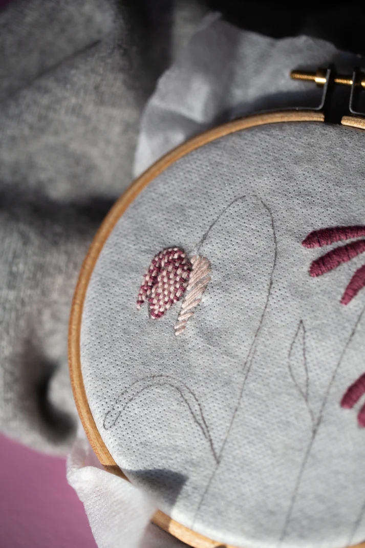 Her kommer du til at brodere ternede vibeæg, lilla solhat og nøgne frøstande i skønne, afdæmpede farver.