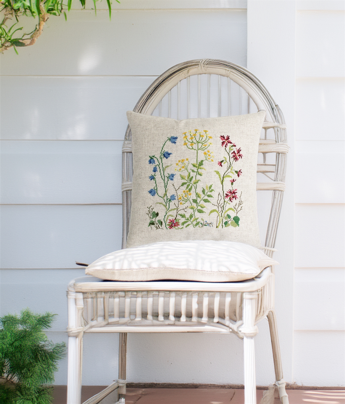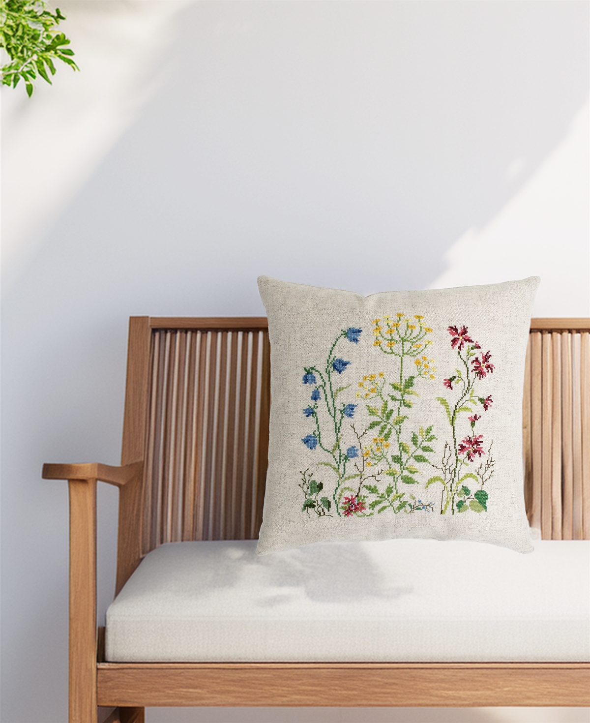 Fin pude med forskellige vejkantsblomster på.