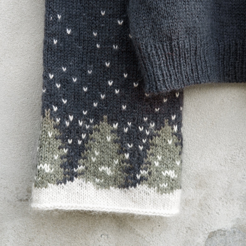 Sne Sweater er et elegant take på en klassisk julesweater med et vinterlandskab på det yderste af ærmerne.