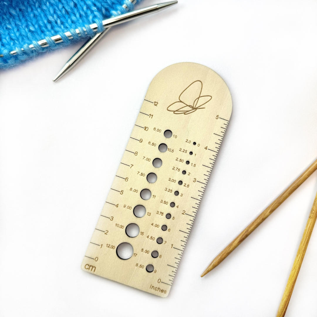 Her kan du måler alle pindestørrelser (i hvert fald alle de pindestørrelser vi har i Sommerfuglen) helt præcist, både i mm og amerikanske mål. Derudover er der på siderne lineal i cm og inches, så du også kan måle dine strikkeprøver.